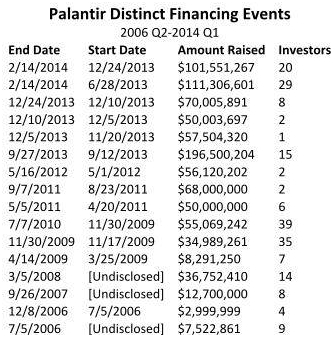 Palantir的财务状况从来没有对媒体公开披露过,但公司的融资进程仍然吸引了诸多媒体的关注。根据美国科技媒体TechCrunch的报道,从 2006 年中到 2012 年,Palantir 经过了几轮稳定增长的融资,但在 2013 年 9 月到 2014 年 2 月,公司启动了一轮大规模融资,总融资额为 5.868 亿美元。交易基本都由摩根士丹利完成。