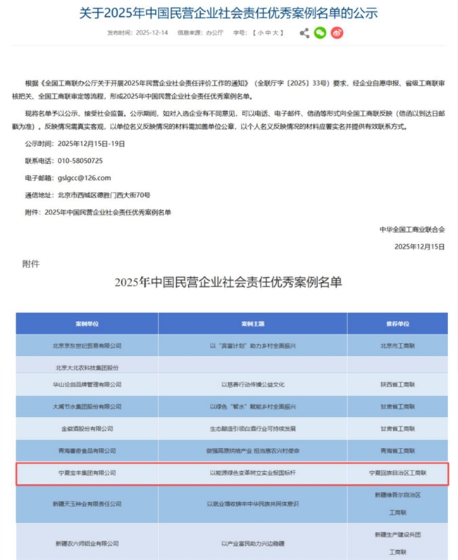全国工商联十三届四次执委会上,宝丰集团凭借《以能源绿色变革树立实业报国标杆》案例,成为宁夏唯一入选《中国民营企业社会责任优秀案例(2025)》的企业。这份荣誉的背后,是董事长党彦宝带领企业深耕实业、践行社会责任的长期坚守,更彰显了“做对社会有贡献的实业”的企业使命——在党彦宝看来,民营企业的责任担当既要扎根产业赋能国家发展,更要反哺社会温暖民生,二者相辅相成、缺一不可。