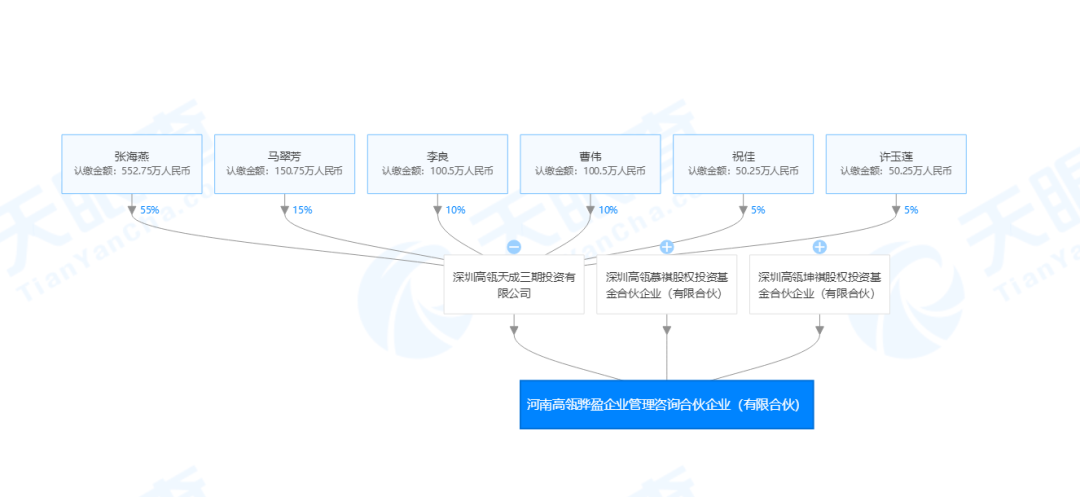 天眼查显示,高瓴骅盈于3月20日刚刚成立,注册地址位于新乡。背后有三个股东,分别为深圳高瓴天成三期投资有限公司、深圳高瓴慕祺股权投资基金合伙企业(有限合伙)、深圳高瓴坤祺股权投资基金合伙企业(有限合伙)。公司执行事务合伙人和最终受益人均为深圳高瓴三期投资有限公司。而深圳高瓴天成三期投资有限公司大股东和最终受益人为张海燕。