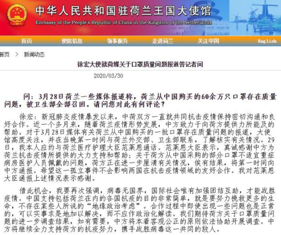据中国驻荷兰使馆网站30日消息,中国驻荷兰大使徐宏就荷媒关于口罩质量问题报道答记者问。