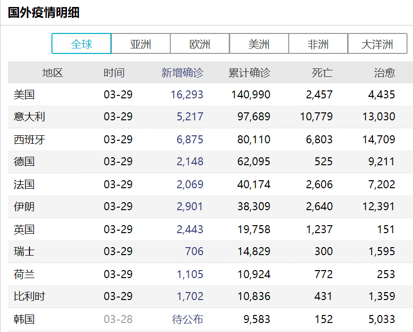 数据显示,全球新冠肺炎确诊病例最多的国家是美国,累计近14万例;死亡病例最多的国家是意大利,累计达10779例。