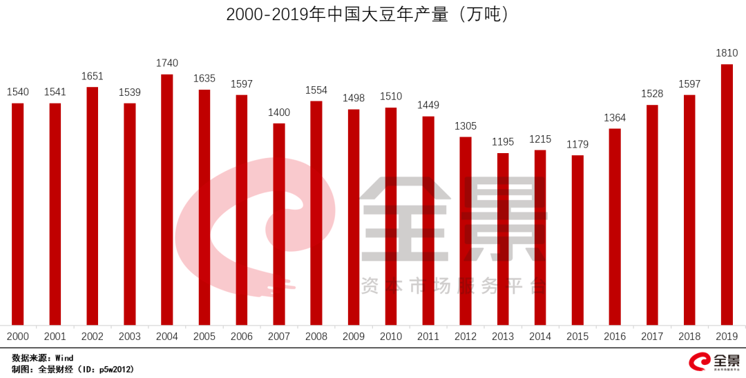 再看中国大豆的产量,2019年全中国产出的大豆数量为1810万吨,仅有进口数量的20%,且这一数字已经创下历史最高记录。