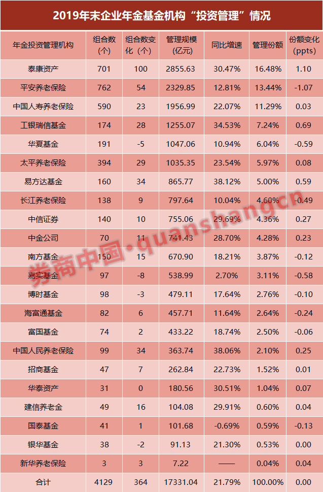 这其中,最新获得投资管理资质的人保养老、新华养老,业务也有进展。人保养老的投资管理资质由人保资产迁移而来,2019年末的企业年金投管规模364亿,管理组合数99个,与2018年相比(含人保资产),规模增长38%,组合数增加34个。