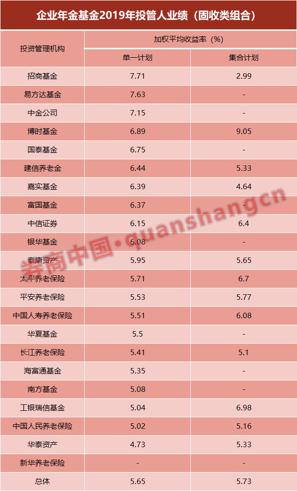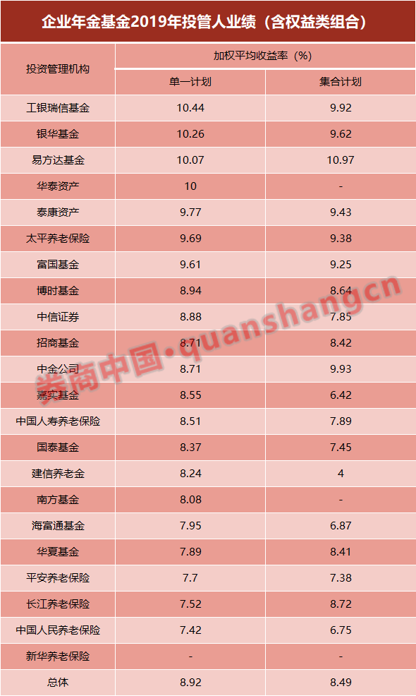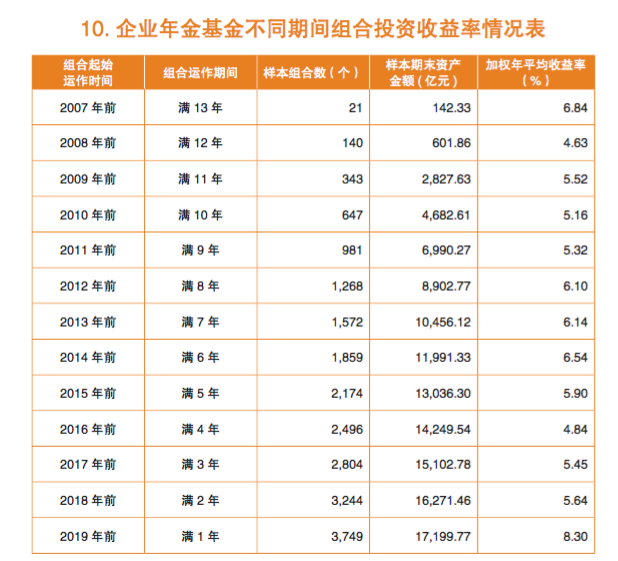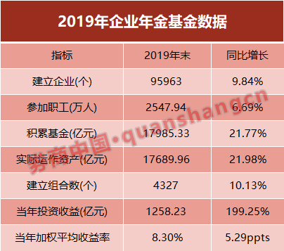 2019年,企业年金基金合计收益率8.29%,其中固定收益类组合的收益率5.67%,含权益类组合收益率8.89%。