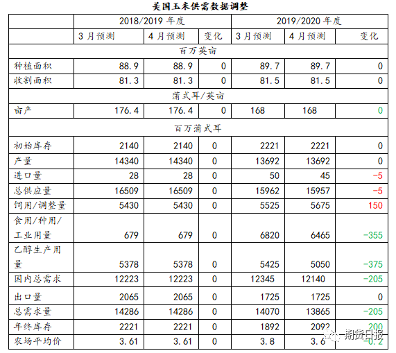 粗粮:本月对美国2019/2020年度玉米的供需预测调整包括:进口量、饲用/调整用量、食用/种用/工业用量下调而年终库存上调。饲用/调整用量上调1.5亿蒲,达到56.75亿蒲。这是基于截至3月1日的库存报告反映的12—2月期间消费量同比增约4%做出的调整。用于乙醇生产的玉米需求量下调也支持饲用/调整用量的上调。基于最新发布的能源信息署数据显示乙醇产量及车用汽油消费受新冠疫情影响史无前例地下滑的情况,本月将用于乙醇生产的玉米需求量下调3.75亿蒲,降至50.5亿蒲。用于酒精、饮料和制造业的玉米需求增加部分地抵消了上述需求的减少。在供应量略下滑而需求大幅减少的情况下,美国玉米年终库存较上月预测的18.92亿蒲大幅上调2亿蒲,达到20.92亿蒲,高于平均预期的20.32亿蒲。预测玉米年度平均价格下调20美分,降至3.6美元/蒲。