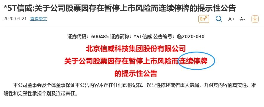 根据上交所的相关规定,*ST信威股票将于公司披露2019年年报之日(4月21日)起停牌,上交所将在停牌起始日后的15个交易日内做出是否暂停公司股票上市的决定。