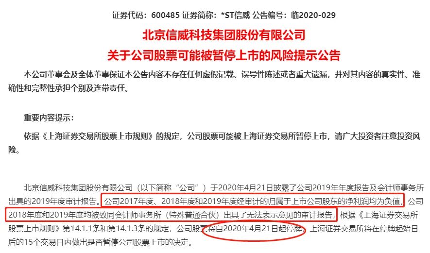 4月20日晚间,*ST信威发布2019年年报,巨亏184.36亿元,连续三年亏损,并且连续两年被会计师事务所出具无法表示意见的审计报告,触发了暂停上市规则。