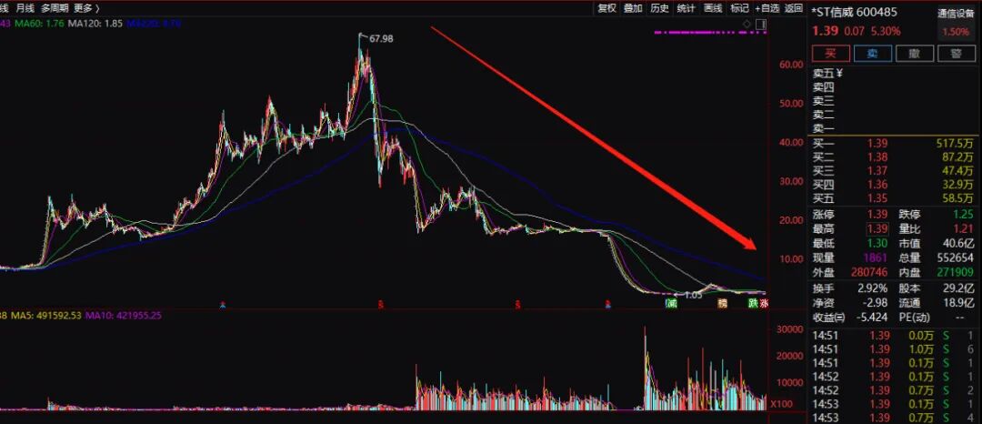 最新数据显示,*ST信威的收盘价为1.39元,总市值仍有40.6亿元,股东户数为12.36万户。