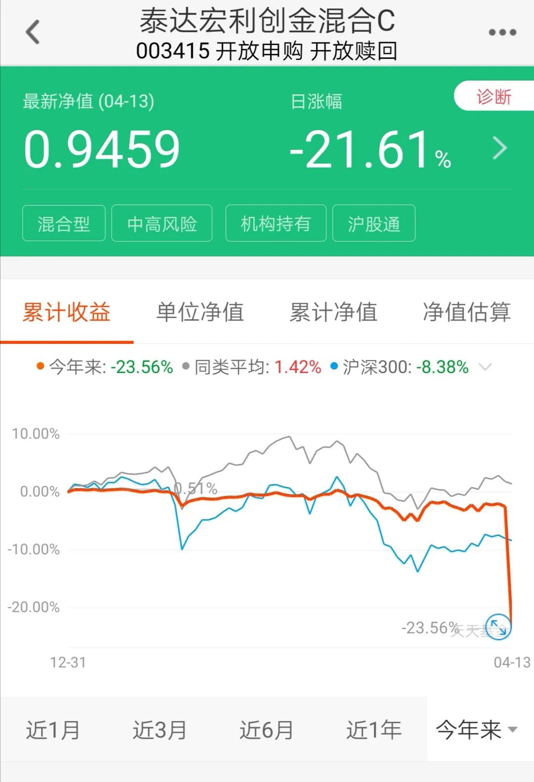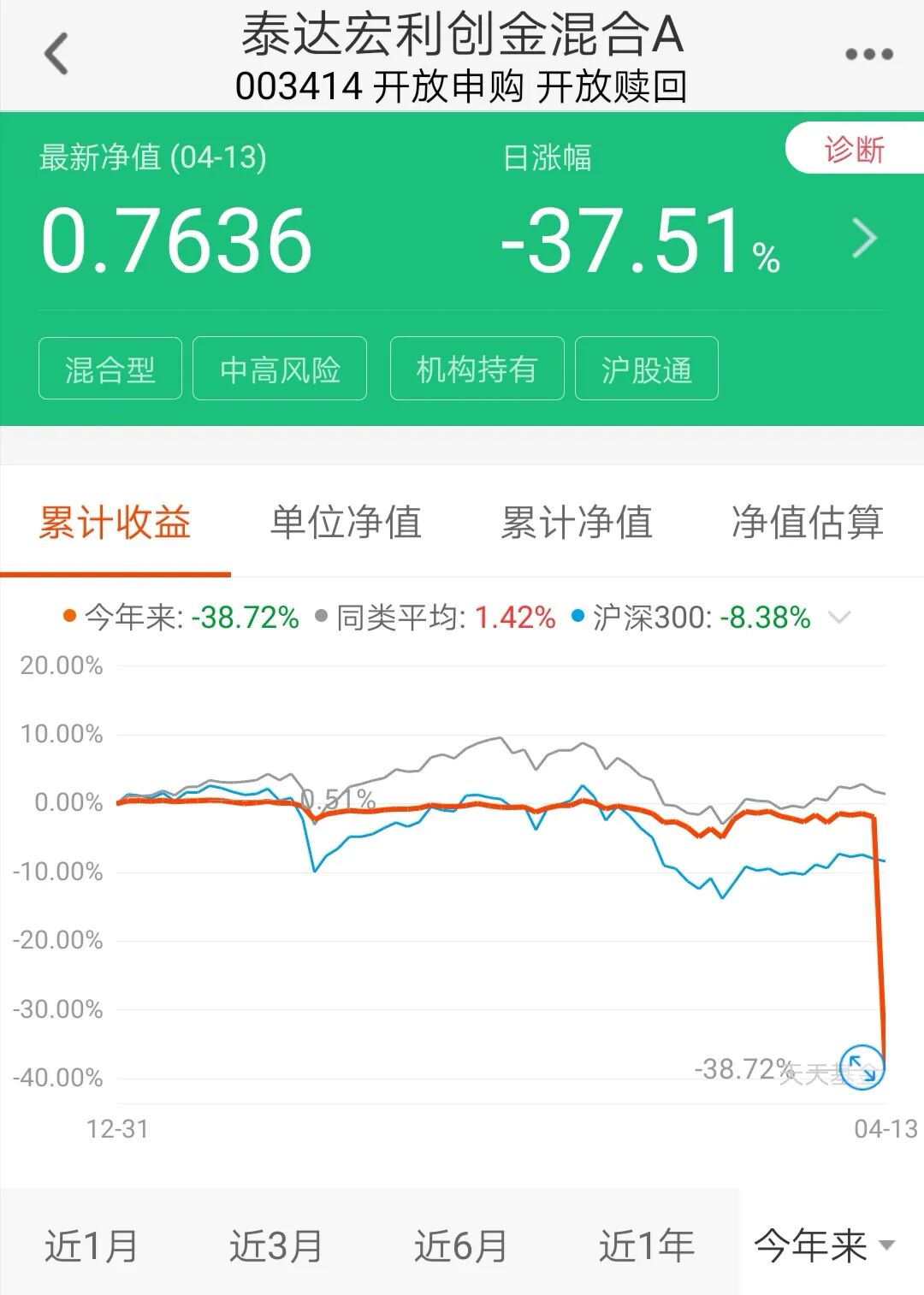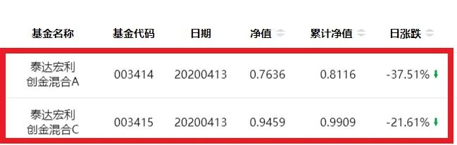 4月13日,泰达宏利创金混合A、C两类份额分别下跌37.51%、21.61%,位列全市场基金跌幅榜第一、第二位。