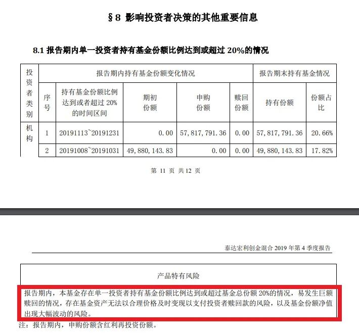 截止去年年末,泰达宏利创金两大机构投资者持有基金份额比例分别达到20.66%、17.82%,基金四季报中也提示,报告期内,本基金存在单一投资者持有基金份额比例达到或超过基金总份额 20%的情况,易发生巨额赎回的情况,存在基金资产无法以合理价格及时变现以支付投资者赎回款的风险,以及基金份额净值出现大幅波动的风险。